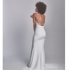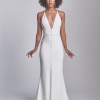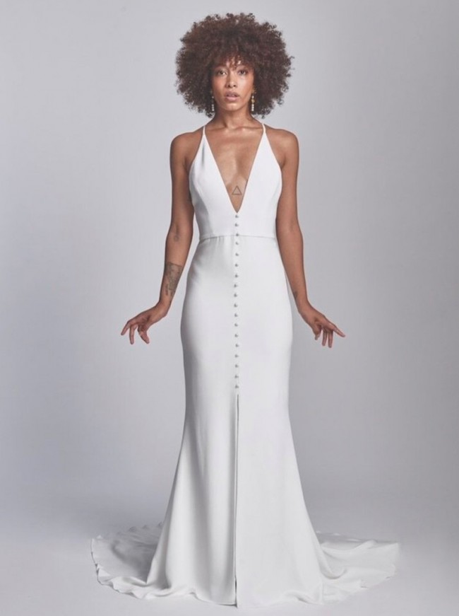 Website description: Haven is for the modern bride who loves clean lines, but is looking for something to set her apart. This gown features a plunging V-neckline, front button detail, and center front skirt slit.