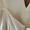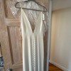 This dress has not been worn! I bought this dress at Alexandra Grecco sample sale to be my second look, I loved the plunging V and slit and thought the buttons in the front were so original. I did not end up wearing it as I found a different dressed I loved more. This dress has not been altered and has very minor flaws from being a sample: a few threads that can be cut and the horizontal strap in the back is a bit loose (this can easily be fixed or the strap can be removed all together). There are no visible stains.