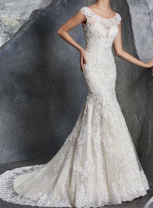 Romantic Fit and Flare Bridal Gown with Crystal Beaded Alençon Lace Appliqués on Net. A Wide Scalloped Hemline and Intricately Beaded Illusion Back Trimmed in Covered Buttons Completes the Look.