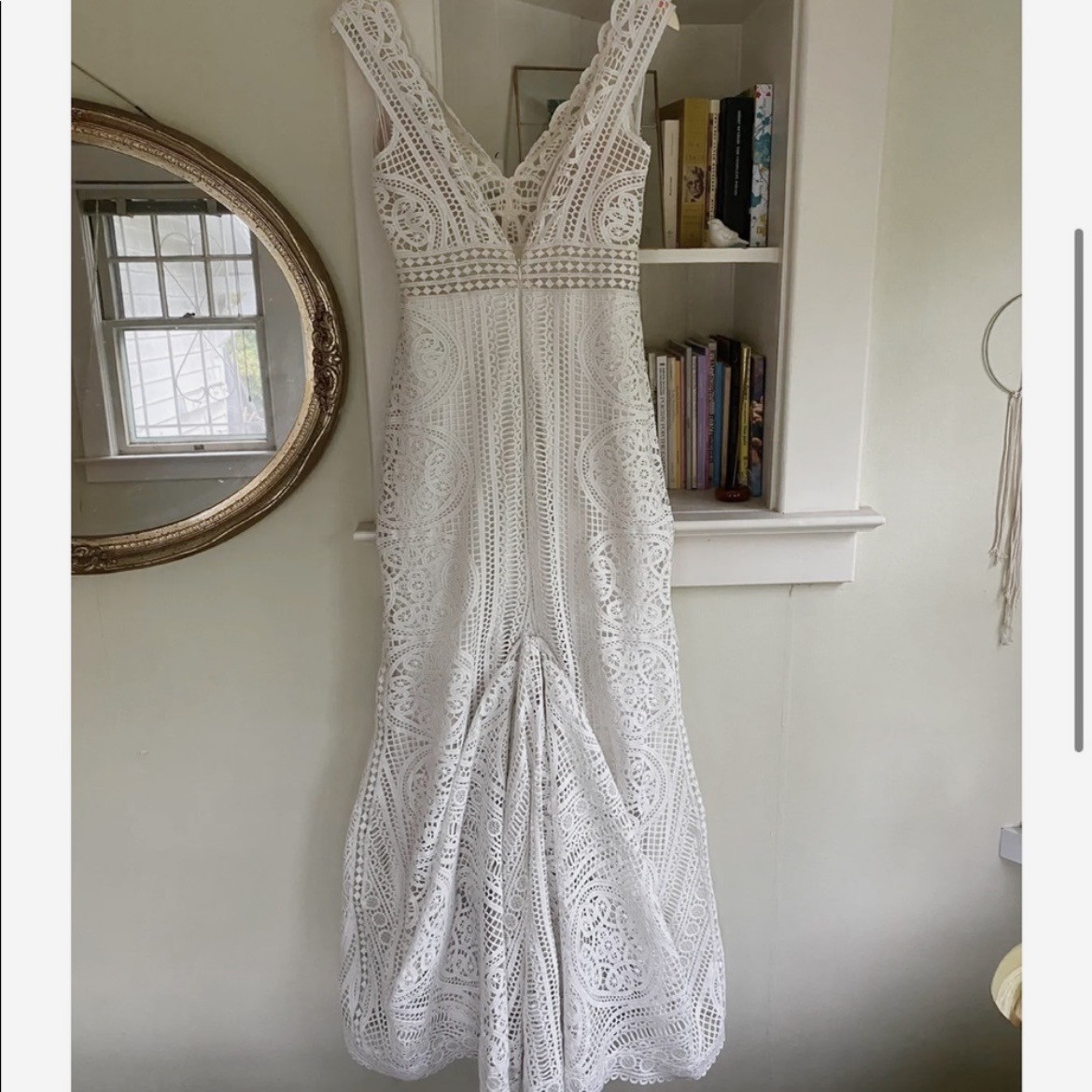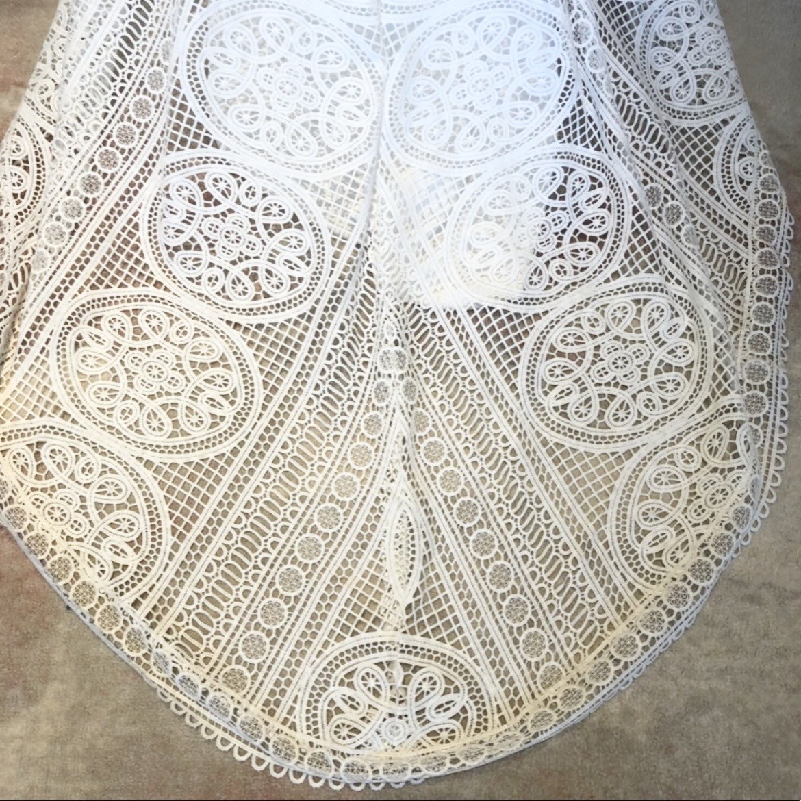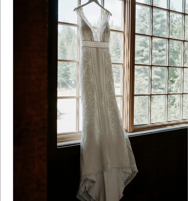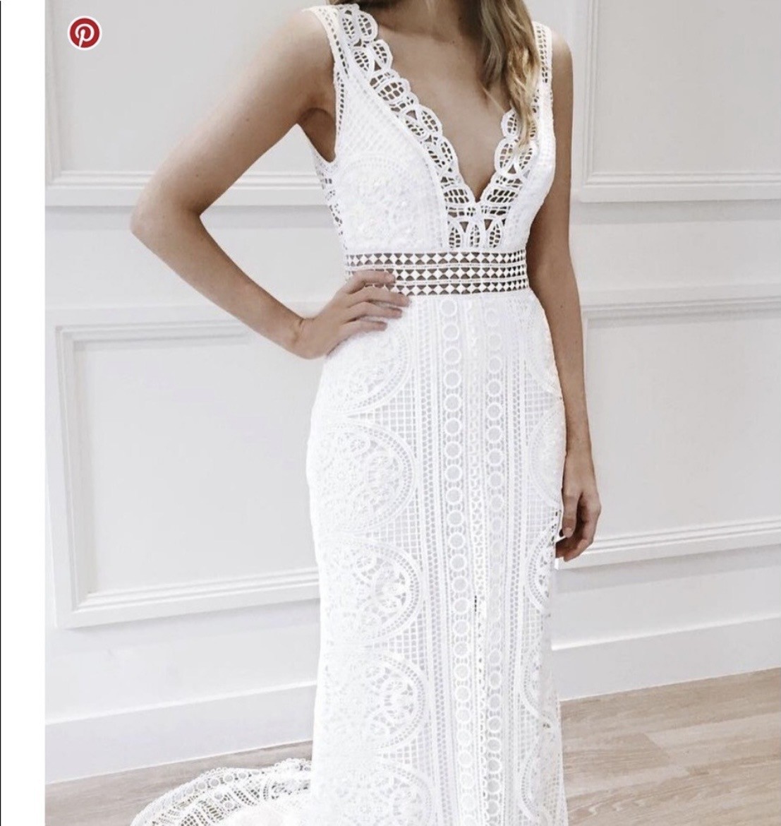 This gorgeous gown by Australian designer Jane Hill that features hand-stitched lace with vintage/bohemian look accompanied by a full silk blend lining. Zipper closure on the back, leg slit in front.