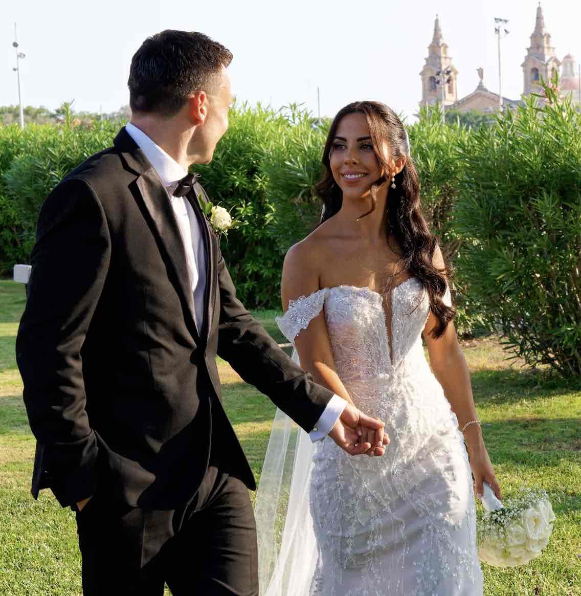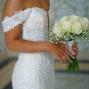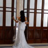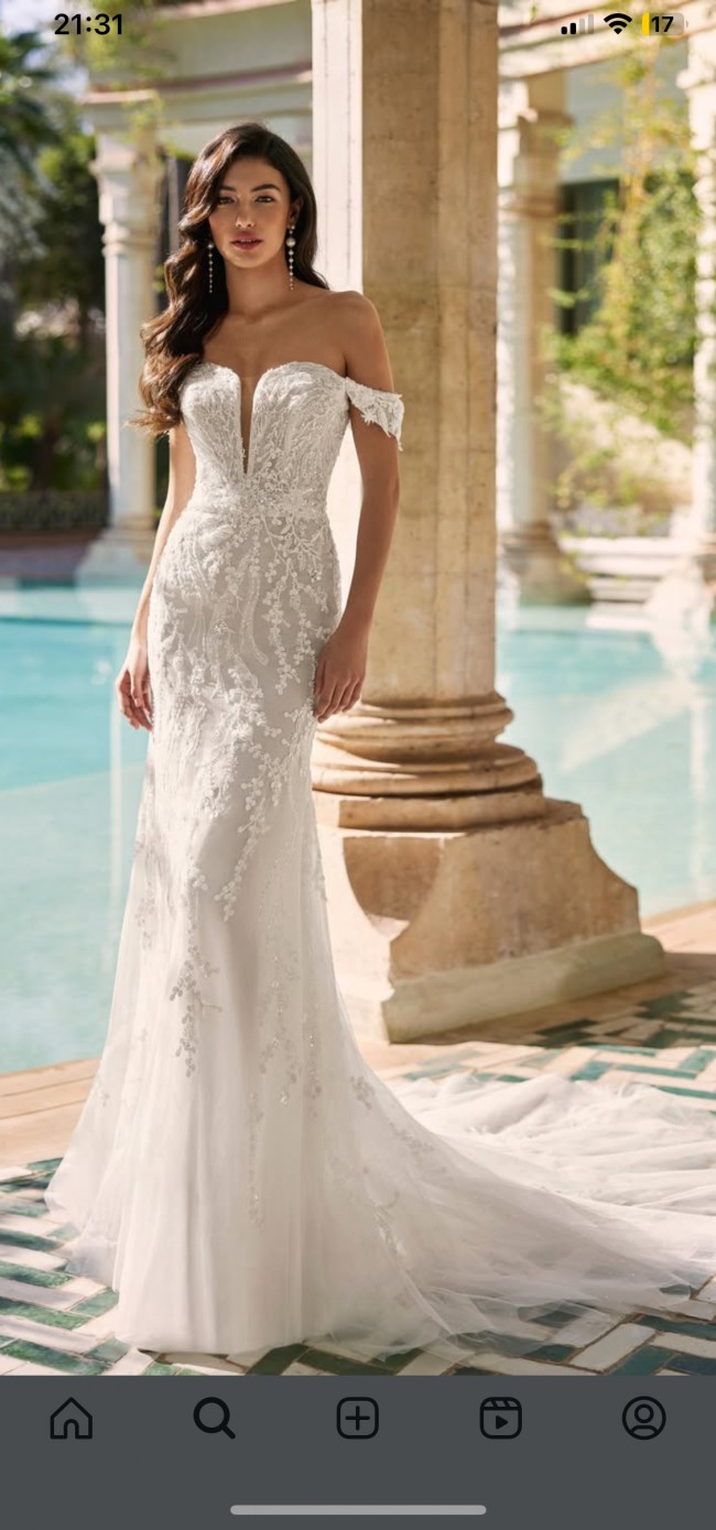 A fit and flare/mermaid-style wedding dress with a sexy style, made with lace and beading. With a deep neckline and dropped lace and beaded straps. Worn only for a few hours for the ceremony and pictures. No defects, good condition only needs dry cleaning for some small minor make up marks/dirt marks around the edge of dress. Straps are off the shoulder and detachable with internal buttons so can easily be removed if wanting to my strapless. Sheer lining between deep V neckline. Slightly padded cups inside so no need to wear a bra.
