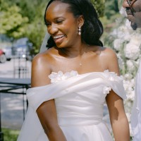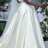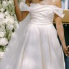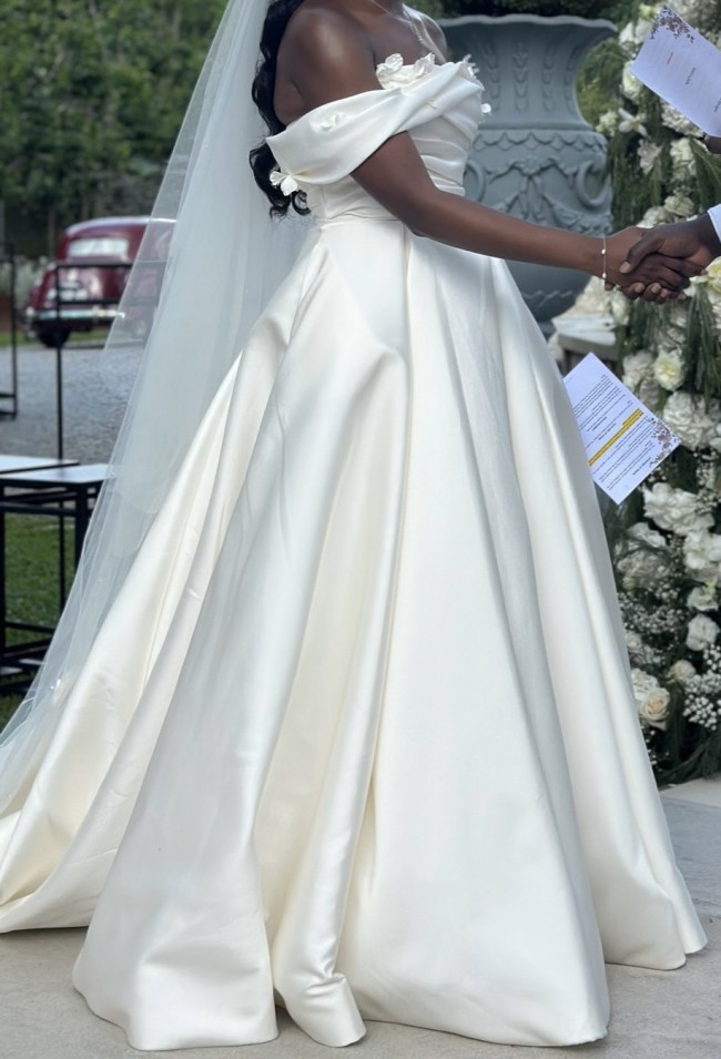 This wedding dress is a timeless and elegant off-the-shoulder gown, made from luxurious mikado fabric with a classic ivory tone.