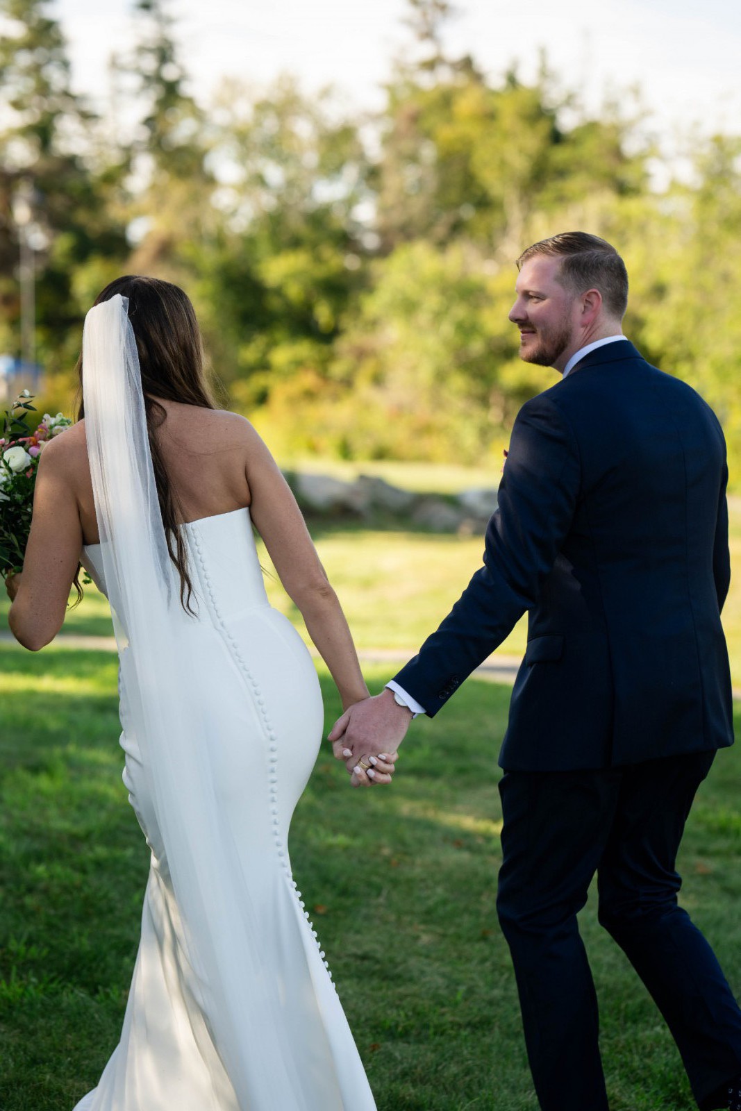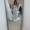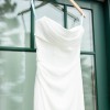 This dress was not taken in at all. Some of the length was taken off so that I could walk in it. I’m 5’9” without heels and 6’0” with my wedding heels on. Buttons added all the way down the back of the dress. Professionally dry cleaned and only worn with love for a few hours.