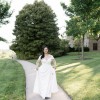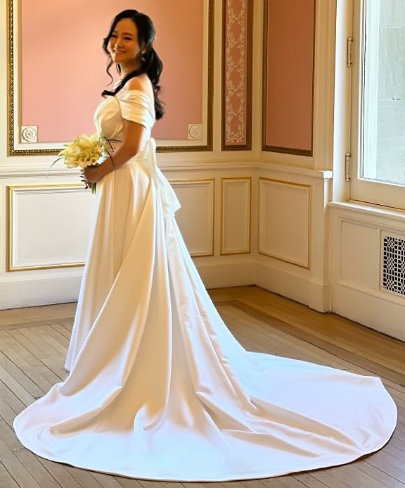 This beautiful off-the-shoulder wedding dress exudes timeless elegance. It features detachable off-the-shoulder straps, allowing versatility in styling for a more traditional or modern look. The dress is crafted with a fitted bodice that flows into a soft, elegant train, adding a romantic touch. The fabric has a smooth and luxurious texture that shines beautifully in natural light. Perfect for brides seeking a classic yet sophisticated design for their special day.