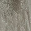 Spaghetti pearl straps, beading up and down the dress! Beautiful buttons on the back, and a gorgeous train! The inside is a silk layer which makes this dress so comfy to wear!