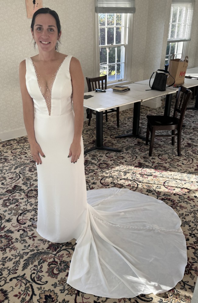 Essence of Australia brand new dress. Illusion neckline. Size 10, altered to me (taken in 2 inches on each side but can be let back out the 2 inches). Bustle complete. Buttons down the back. Altered to 5’3 which 3 inch heals. Never worn outside of alterations. Decided to go with something else.