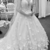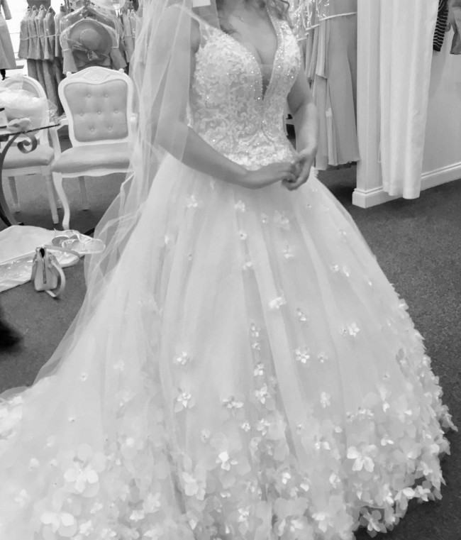 This is a stunning 3D floral dropped waist ball gown with a gorgeous chapel length floral train. This listing is for the Ivory/ Ivory colour UK dress is more of a street size UK10 and has a slimming effect on the waist as shown in me wearing it in the first picture. You can wear it naturally for a bohemian floaty look but I recommend a small hoop for the A line effect. Or you can add a double hoop wide underskirt to turn it into a large ball gown… the choice is yours. The dress needs dry cleaning and some crystal (holders) backs have tarnished which can be easily replaced if you’d like a bargain project to do hence the reduction in cost. For an additional £50 I can dry clean and supply you with all the original crystals brand new, package worth £200. I also have a stunning Ronald Joyce long veil with an embroidered border with sparkling lace and 3D flowers I paid £550 for which I am selling for £150. This dress is sought after due to its quality and appeal and beautiful shape it is a truly romantic gown. The bodice is encrusted with crystal, is totally sparkly whilst the 3D flower centres have crystals, sequins and beading in along the skirt which will leave you shining bright like a diamond. Don’t just save me, ask me a question and I will help you as much as I can 🙂