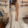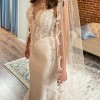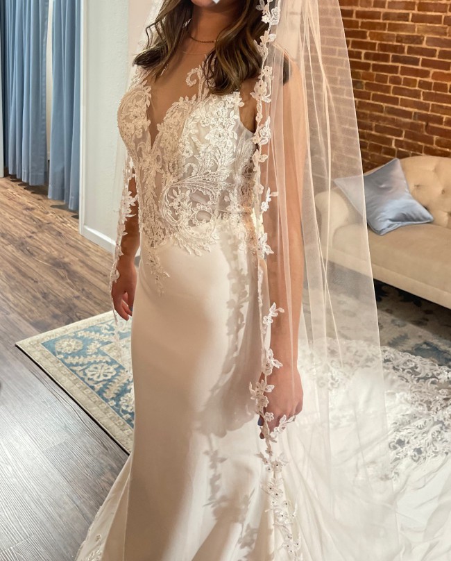The dress features a breathtaking cathedral-length train adorned with exquisite lace detailing, along with elegant buttons that run all the way down the back. The top showcases a delicate mesh material, beautifully complemented by intricate lace accents, creating a romantic and timeless look. The back upper portion mirrors this design, adding a touch of sophistication.