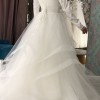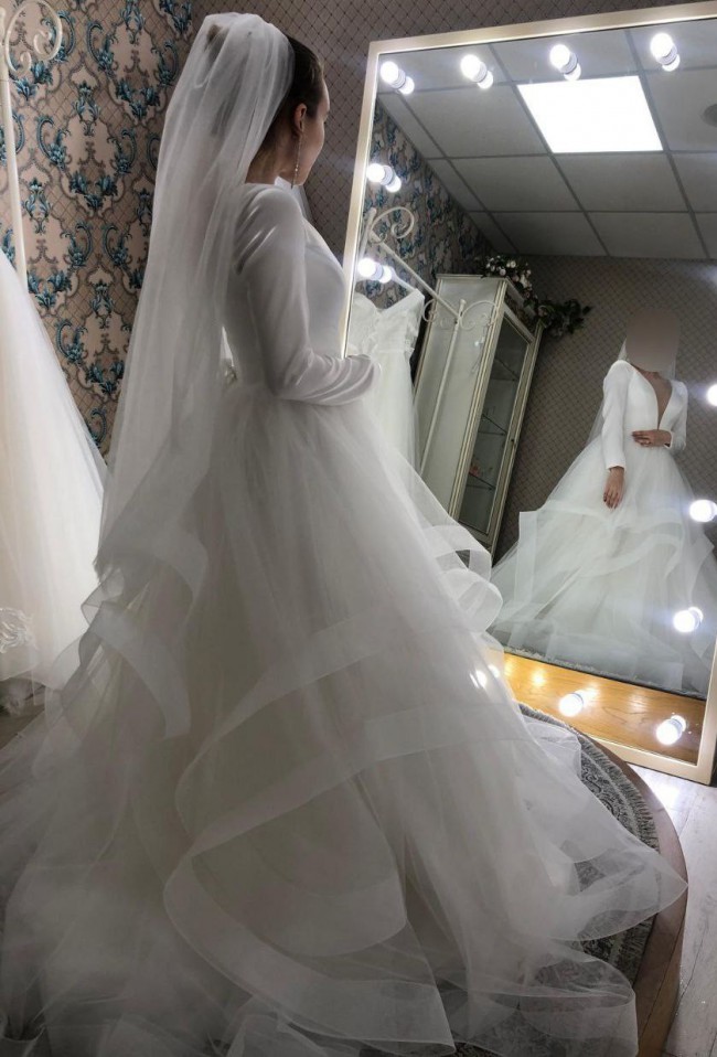 This classic, beautifully crafted wedding dress features a sleek satin bodice with long sleeves and a dramatic plunging neckline, providing a perfect balance between elegance and modern style. The voluminous tulle skirt, adorned with delicate layered ruffles, creates a fairytale-like effect, ideal for making a grand entrance. The back showcases a romantic lace-up corset, ensuring a perfect fit and comfort throughout your special day. Paired with a long, flowing veil, this gown is perfect for a bride who desires a sophisticated and graceful look.