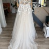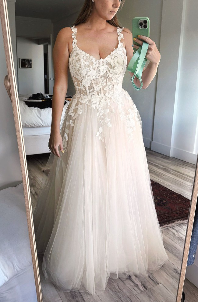 Ivory lace over ivory tulle. champagne tulle, champagne satin lining, unlined skin bodice with Chantilly lace. Buttons over zipper.