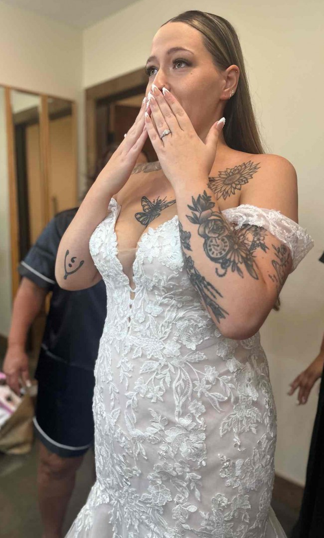 David’s bridal Lace Applique Mermaid Strapless Wedding Dress size 16 and Cathedral glitter veil. Dress is altered to a 14 with added bra pads, detachable off the shoulder straps, under bustle and waist band on the inside added. only wore for 3 hours for my wedding. in great condition, has been dry cleaned and comes in bridal bag.