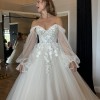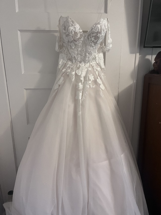 It’s a floor-length ball gown with detachable features that give you multiple looks in one: delicate over-the-shoulder “sleeves” and romantic long sleeves, both removable to suit your style (both pictured). The skirt is unhemmed, and the dress has not been altered—it’s exactly as I bought it. The subtle glitter on the skirt and the elegant buttons down the back and train add a touch of magic.