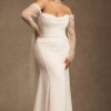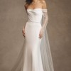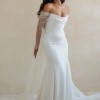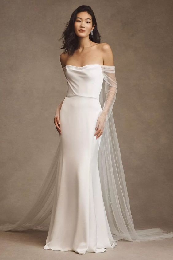 Modern details elevate and update the otherwise timeless silhouette of the Olivia gown. Cut in our elegantly fluid luxe satin fabric, the draped cowl bodice lead way to a sheer off the shoulder sleeve. Curved princess seams sculpt the fit and flare skirt, and detachable tulle streamers lend a hint of whimsy.