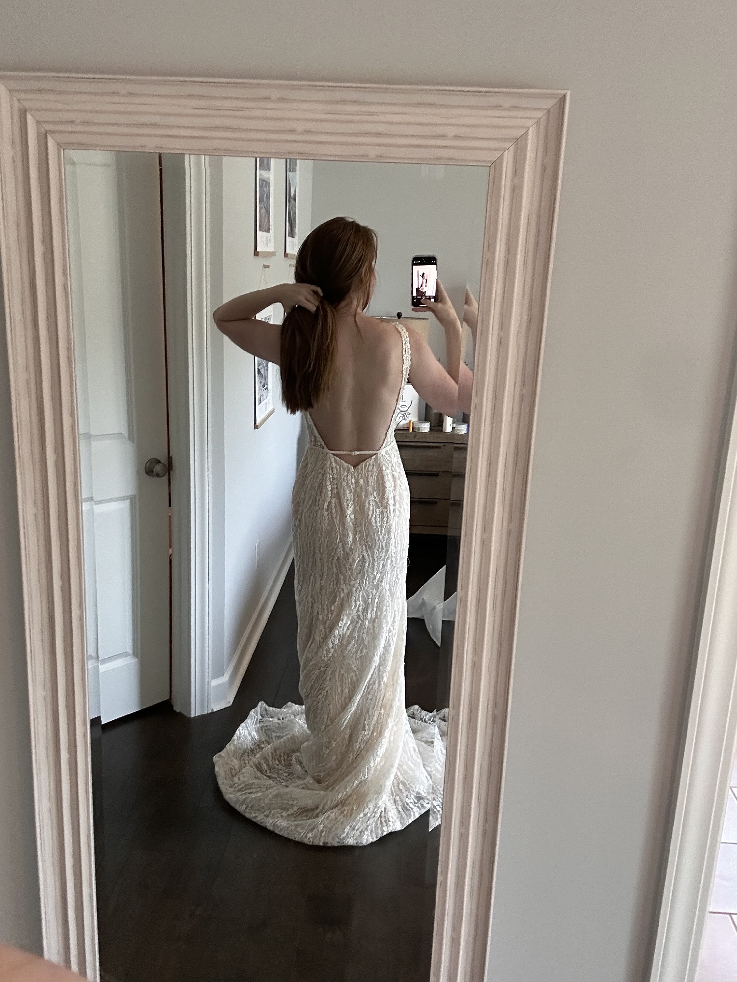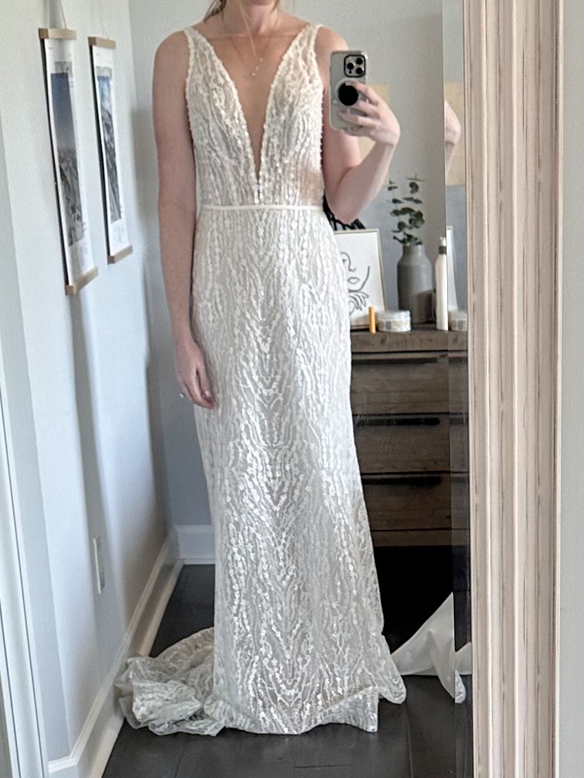 I bought this during a sample sale before I chose my wedding venue and I decided to go with a different dress. It is truly beautiful, just a little fancy for my location now! I never wore it and never had it altered (it is sample size so you will likely need to get it tailored). It is a KYHA size 4, I have listed the measurements per their size chart in the description. The color is ivory/nude.