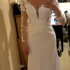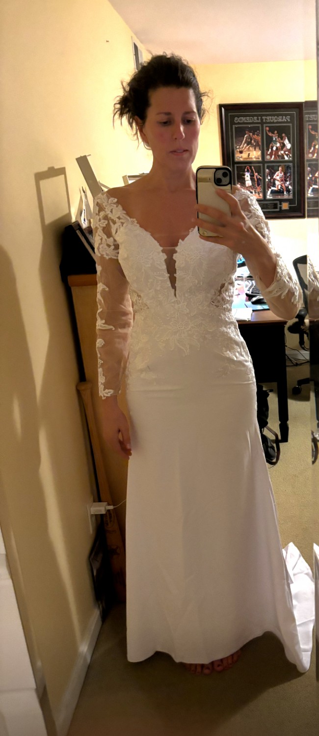 Brand new, white, long sleeved wedding dress with lace appliqué. Purchased online and it was slightly too tight, so I found another dress. Measurements in this listing are the dress's measurements according to the size guide from the online shop, not my measurements. I’m 5’10” and it was slightly too short without shoes, so it’s better for ladies who are a few inches shorter than me.