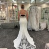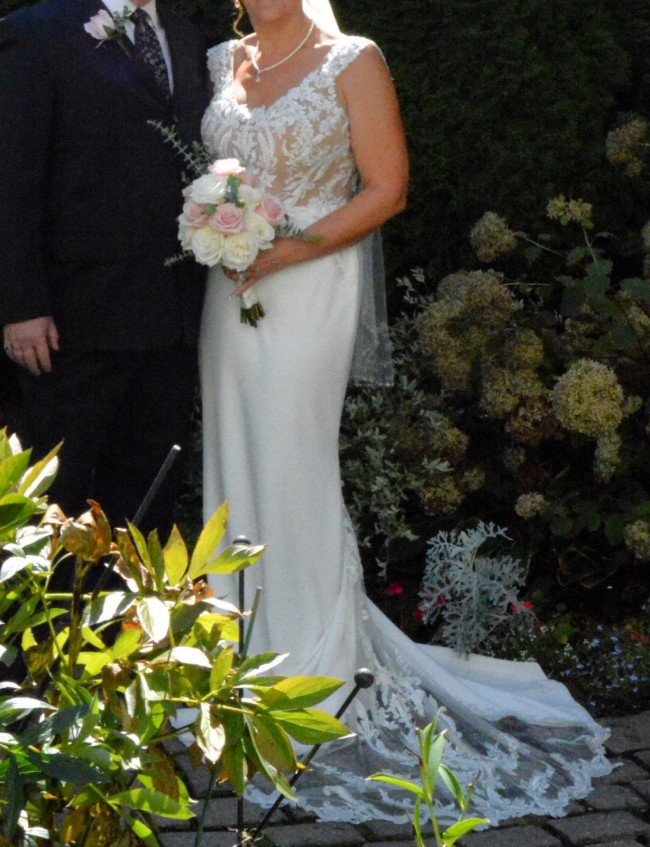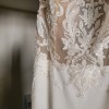 Stretch crepe wedding dress layers two types of lace for the incredible illusion bodice and chapel train. Power mesh lining provides built-in smoothing.