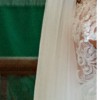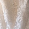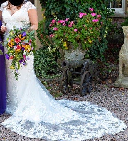 The train is the most beautiful lace which is what made me fall in love with this dress when I bought it, gathering behind you and surrounding you when laid out, sparkline in the light as it is covered in beads and crystals. The veil is is very simple so it doesn't detract from the dress, it is a plain lace with crystals around the edges which match the crystals on the dress. The length of the veil (at least when I wore it) came to just above my knees and created the most beautiful waterfall effect with the crystals. I have tried to show this in the photos.