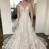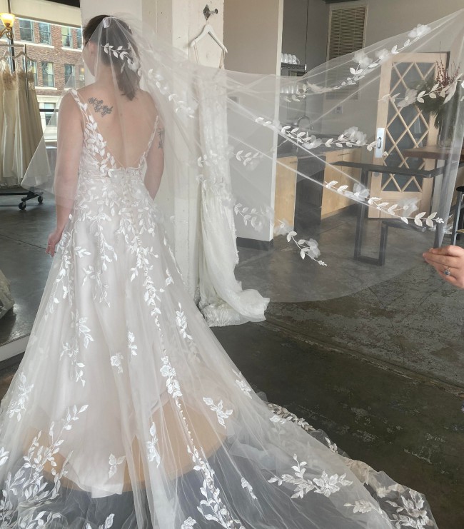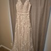 This is a beautiful gown that was bought and never worn. It has a unique champagne and ivory color. It has had no alterations done to it. It felt comfortable and breathable when it was tried on. There are no issues with the dress, it is in perfect condition. The veil pictured will come with the dress and compliments it perfectly.