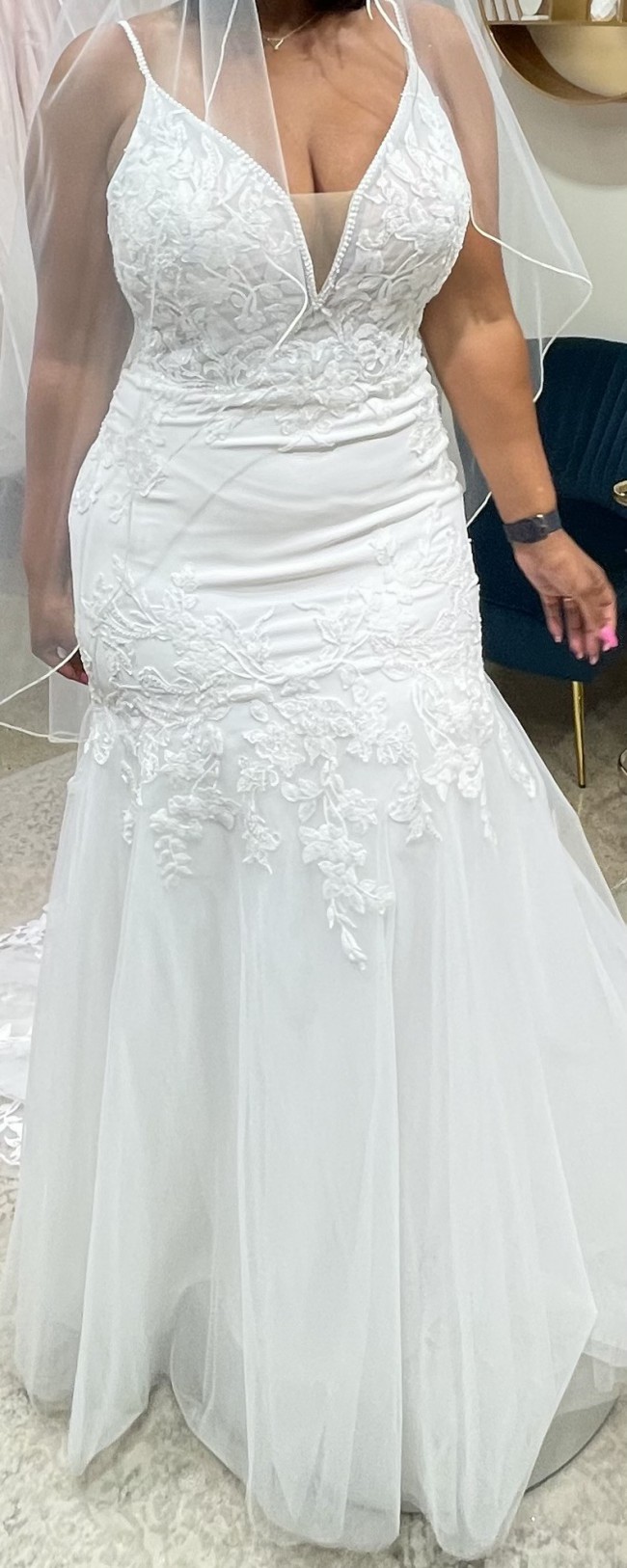- Dress was altered in the chest to better support cleavage and hemmed a the bottom due to wearing flat shoes on the wedding day