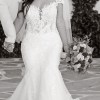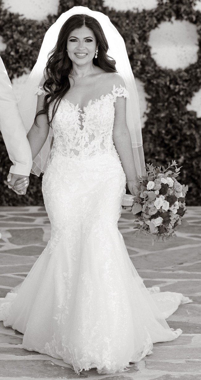 Dream dress alert! A stunning combination of layers of lace, crystal beading, and ultra-comfortable stretch jersey, the Gigi gown is everything you've been dreaming of and more! The flattering V-neckline is complemented by a sexy micro-plunge and laced straps, leading to an illusion lace back trimmed with buttons. Floral-inspired lace is artfully placed throughout the entire gown to highlight your curves and flows beautifully into the flared skirt. Beautiful elegant sparkle ✨