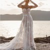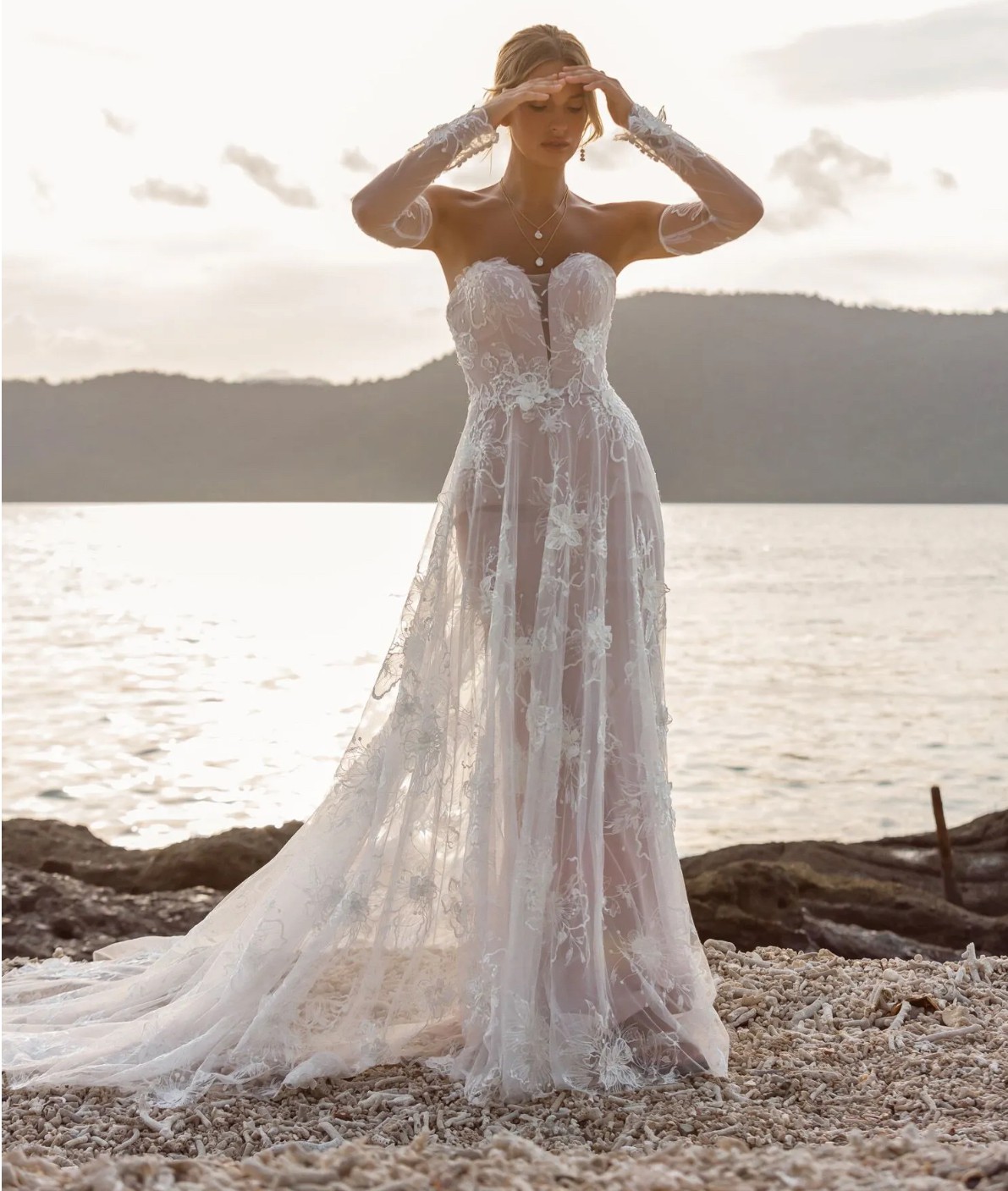 Rising from the ocean you will discover Janae. A strong Madi Lane signature A-line silhouette flattering on all body shapes and sizes. Her character radiates love and passion. Flattering to the eyes is her strapless sweetheart bodice and narrow center plunge. Discover two looks with her detachable illusion long sleeves button-up wrist to elongate her bride’s arms. Completing Janae’s vision is a beautiful sheet lace with a soft sequin detailing and a 30” illusion train to follow.