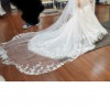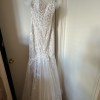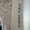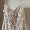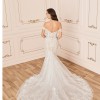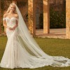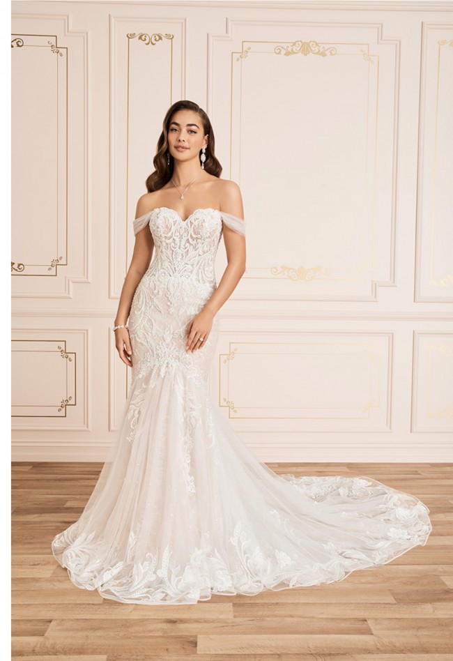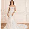 Sophia Tolli Y12033 Clarissa trumpet-style bridal dress features a corset illusion bodice with a sweetheart neckline and ruched off-the-shoulder straps. Covered buttons on the illusion back point toward the gathered skirt and cathedral train. This form-fitting wedding gown is crafted in beaded lace-appliqued tulle over chantilly lace and stretch jersey. Set includes a separate bodice lining. Shown with veil sold separately as Style Y12033VEIL.