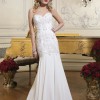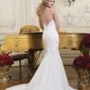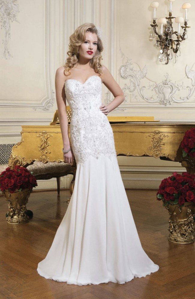 Bugle beads, crystal, and pearl covered bodice with a sweetheart neckline on a chiffon fit and flare wedding dress. The gown is finished with chiffon covered buttons over back zipper and a chapel train.