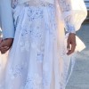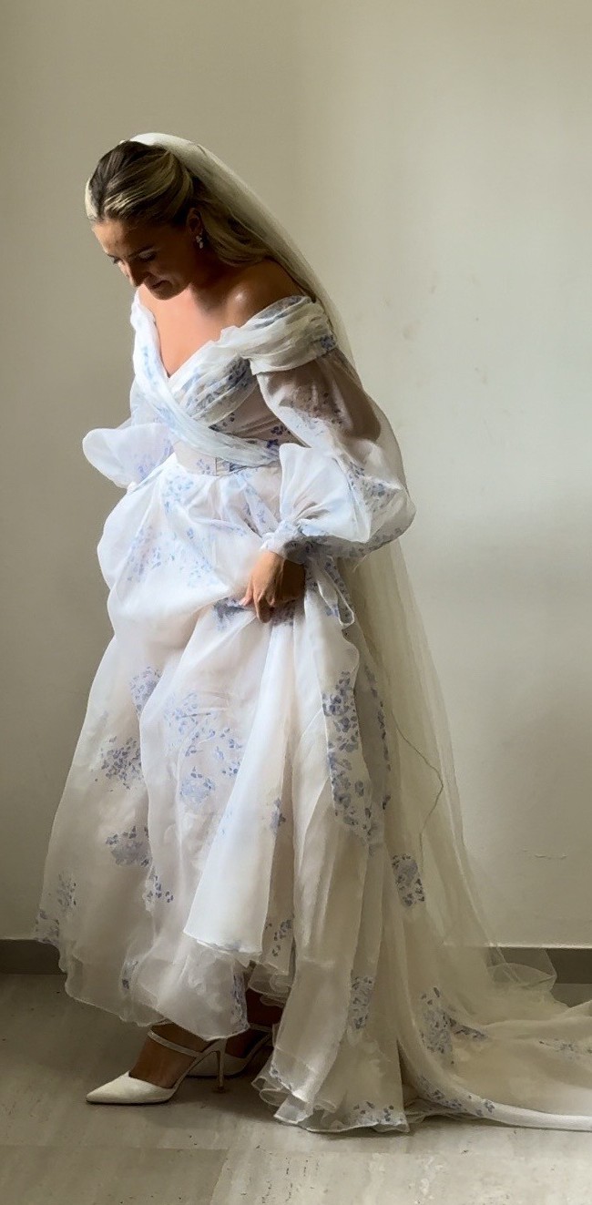 The skirt is quite full but incredibly flattering and lightweight, the nude tulle looks stunning under the blue floral silk overlay - the train is short and I added a tiny loop for a bustle to lift it off the floor.