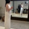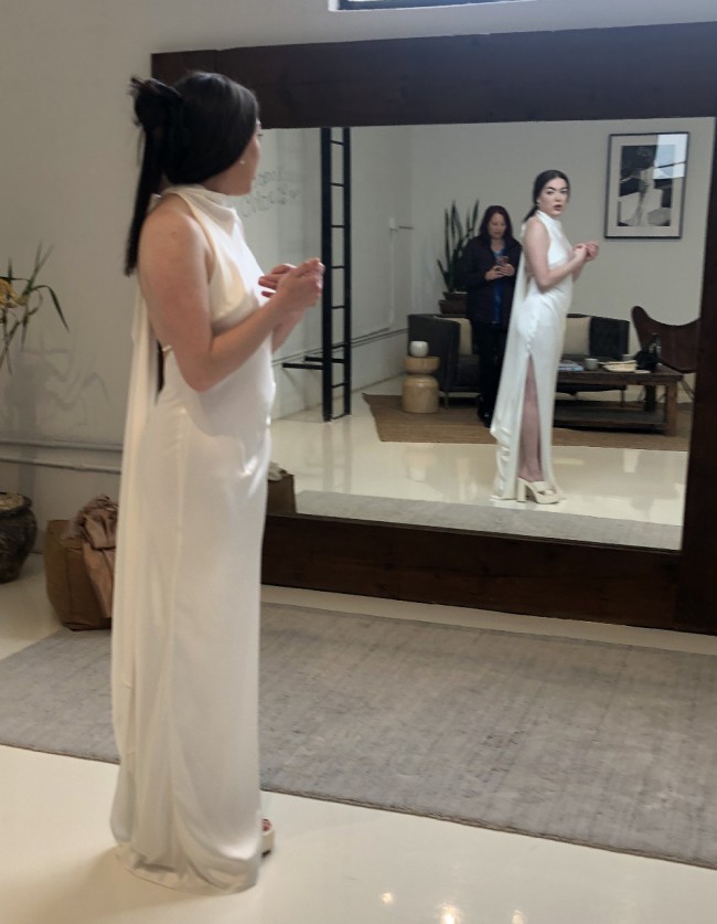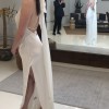 GRACE LOVES LACE GOLDIE - NEW - NEVER WORN OR ALTERED (retail $3300) Modern elegant gown made from, ivory, medium weight, smooth finished satin, made with with a double layer of satin. The gown is a bias cut, sleek silhouette that fits smooth over body. The neckline is high and draped with a halter like back neck tie. The back is low and open with an adjustable back strap that adds additional support. The column skirt is biased cut and has a slight flare at the hem. A dramatic mid thigh slit add elegance and sophistication to this modern wedding gown. This custom made gown takes 5.5 months to receive from the retailer, get your NEW dress ASAP without the wait!