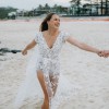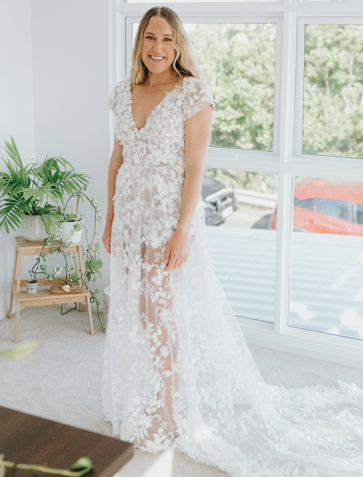 Selling my beautiful, custom-made wedding dress inspired by Kate Willa's designs. Crafted with delicate Latvian lace, it features hand-sewn 3D flowers and subtle sequins for an elegant shimmer. The dress comes in two pieces: a cocktail-length dress and a detachable skirt with a chic side split.
