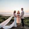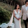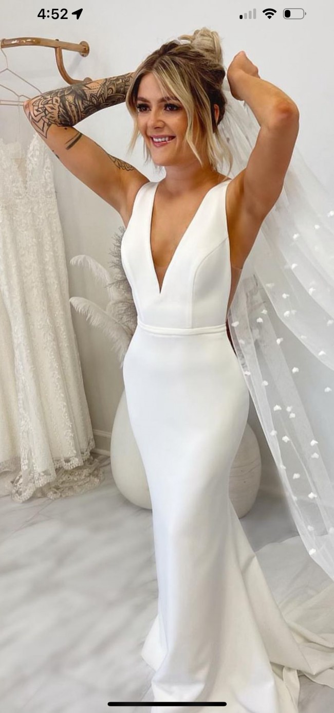 Ryder Crepe made with higher neckline by MWL. Includes beautiful wings that can be easily detached. Dry cleaned. Minor marks on train that would likely come out with second dry clean
