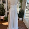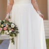 This a-line dress has a light chiffon skirt with a beautiful lace top, plunging neckline, and illusion sleeves. There is simple medium length train.