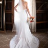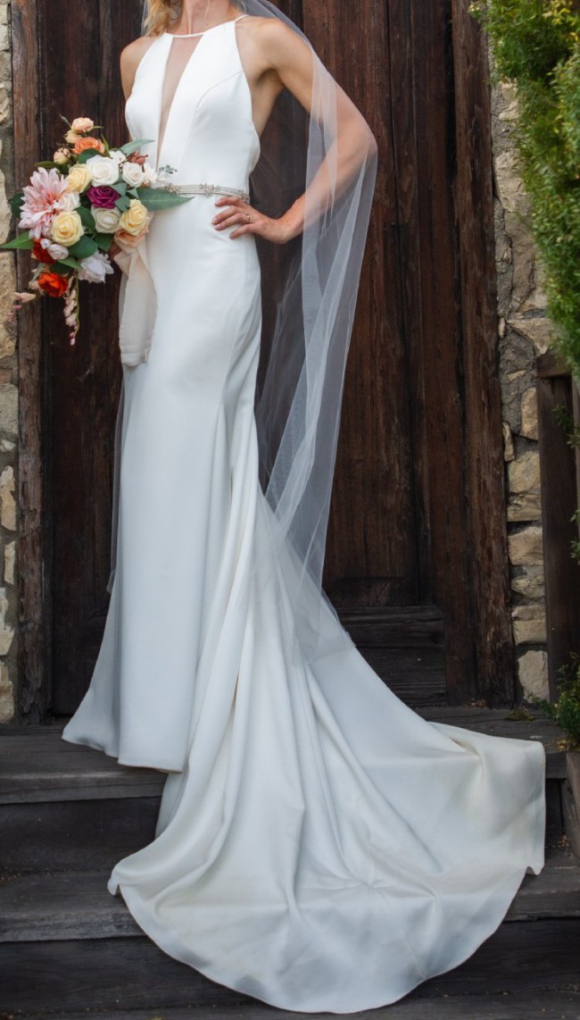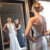 Plunging halter neckline with deep illusion plunge V. Halter is supported by a continuous thin piping that ties into the low back.