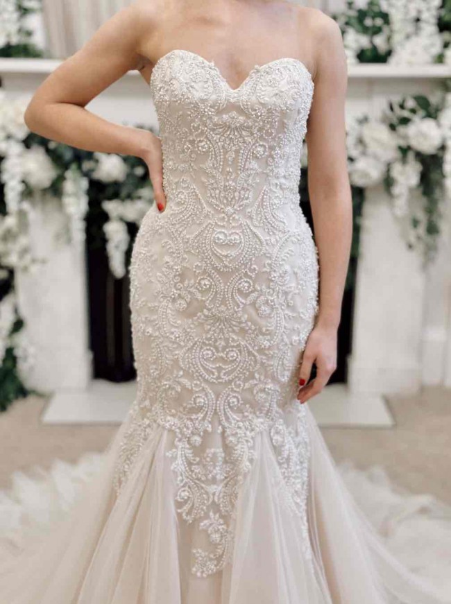 Supreme quality, this trumpet gown has a huge amount of flare at the bottom and the drama that can be exaggerated furthermore with mermaid hoop. It has a well structured bodice that holds you in and is heavily encrusted with sparkly crystals, pearls and beading all over the bodice. Makes a perfect evening gown because it is so so sparkly. Don’t just save me, ask me a question and I will help you as much as I can. Make me your best offer 🙂