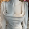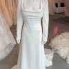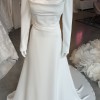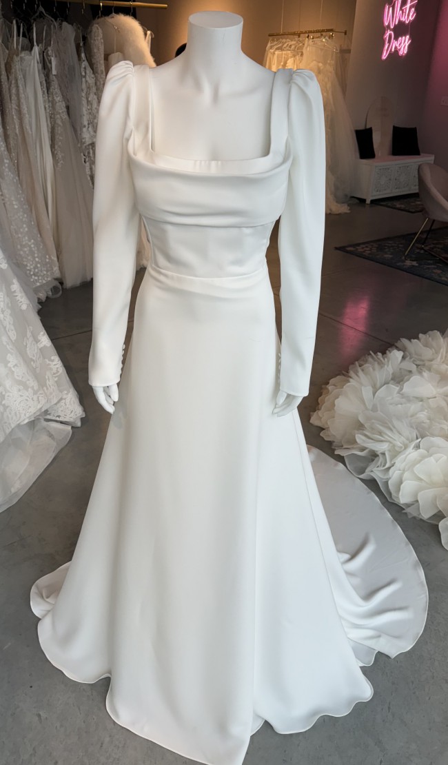 Pronovias Betsy is a Flared crêpe wedding dress with square neckline and long sleeves. This sample is in near perfect condition and ready to ship ASAP! Perfect for brides with a tight timeline. Let us know if you have any questions!