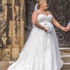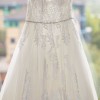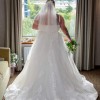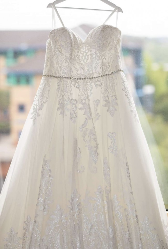 Most stunning dress, embroidered all round the bottom. Straps were added but can also be removed. Lovely little train, easy to hold an wear.