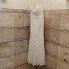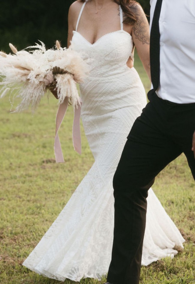 The back of the dress was altered for more support. Can easily be changed back. Train was trimmed a few inches. And bustle added with hooks. Have all the extra materials. Cup pads removed