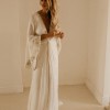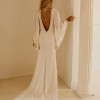 The bodice is given shape with a knot to the centre, while the gorgeous trumpet sleeves are framed with the sample beading seen across the neckline. It is fastened to the reverse with a hidden zip fastening and the skirt falls into a generous train.