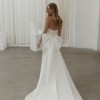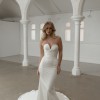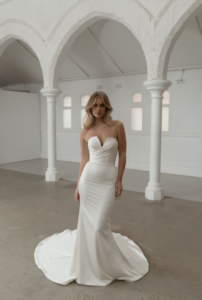Radiating with pure elegance, Silas effortlessly captivates through her understated stretch satin fabric. An asymmetrical pleated bodice harmoniously meets her shallow yet striking strapless V-neck, infusing drama with every angle. Her slim fit and flare silhouette boasts an unembellished sophistication, celebrating the power of a simple, clean shape. Adding a touch of intrigue, Silas unveils a dramatic, oversized detachable bow at the back, offering the versatility of two distinct wedding day looks. With Silas, embrace the beauty of minimalism and allow her to be the embodiment of refined charm on your special day.