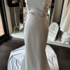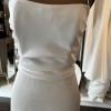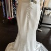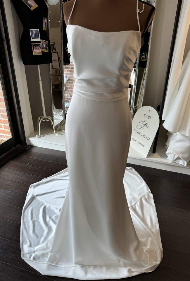 Charmeuse fit and flare with scoop neckline and spaghetti straps that lead to a V-back. Bodice features draping on front and back. Complete with jersey lining, invisible zipper, and charmeuse covered buttons to end of chapel length train.