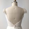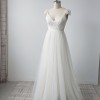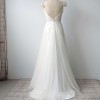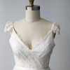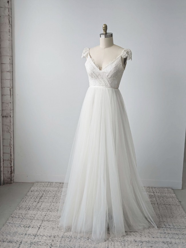 Hand draped, pleated French Chantilly lace bodice with satin tie waistband and scalloped cap lace sleeve. V neckline and low back. Gathered A-line tulle skirt with small train.