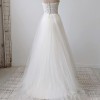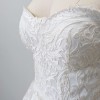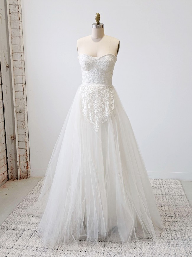 Strapless gown featuring embroidered lace hand appliquéd over ivory matte faille. Sweetheart strapless corset bodice with faille waistband. Layered ivory tulle skirt with appliquéd lace panel and sweeping train. Only one of this design was made.