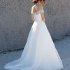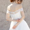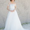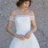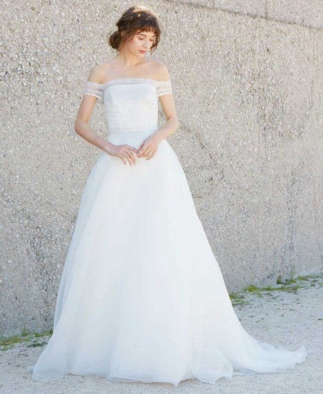 Sparkling, embellished stripes encircle a delicate off-the-shoulder bodice that's secured with dainty rouleau buttons down the back. An ethereal organza ballgown skirt is the perfectly floaty finish to this modern, romantic look.