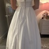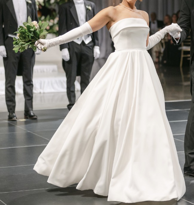 2023 Justin Alexander Satin Strapless Ballgown. It has buttons all the way down the back zipper and an adjustable corset inside the dress, so it never feels like it will fall down, even on the dancefloor. It has been professionally dry-cleaned and preserved. The only flaw is that the clasp on the top of the zipper is missing, but the dress easily zips and stays on due to the nice material and corset. This dress is made of the most beautiful material, and I would choose it 1000 times over again! And it has POCKETS! A dream! The video shows how beautifully the dress moves in the full satin skirt. I have 2-inch heels on and am 5'6. I usually wear a 2 in top and 4 in bottoms.