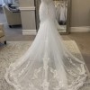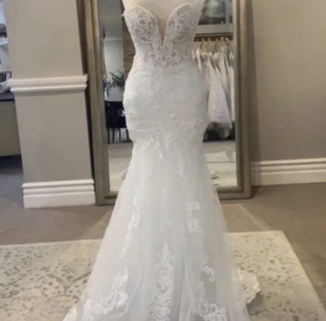 All about that graphic lace, this strapless wedding gown is a sheer masterpiece. Side cutouts and a sheer bodice set the stage for negative space detailing throughout the gown, which flows throughout the silhouette for modern dimension. Linear detailing along the strapless bodice and skinny plunge neckline highlight your shape in this fit-and-flare wedding dress, while the laces are thoughtfully cut along the waist to accentuate the curves. The full, scallop lace hemline is created with horsehair to help create a true floating look—complemented by the traditional train styling with a finished edge.