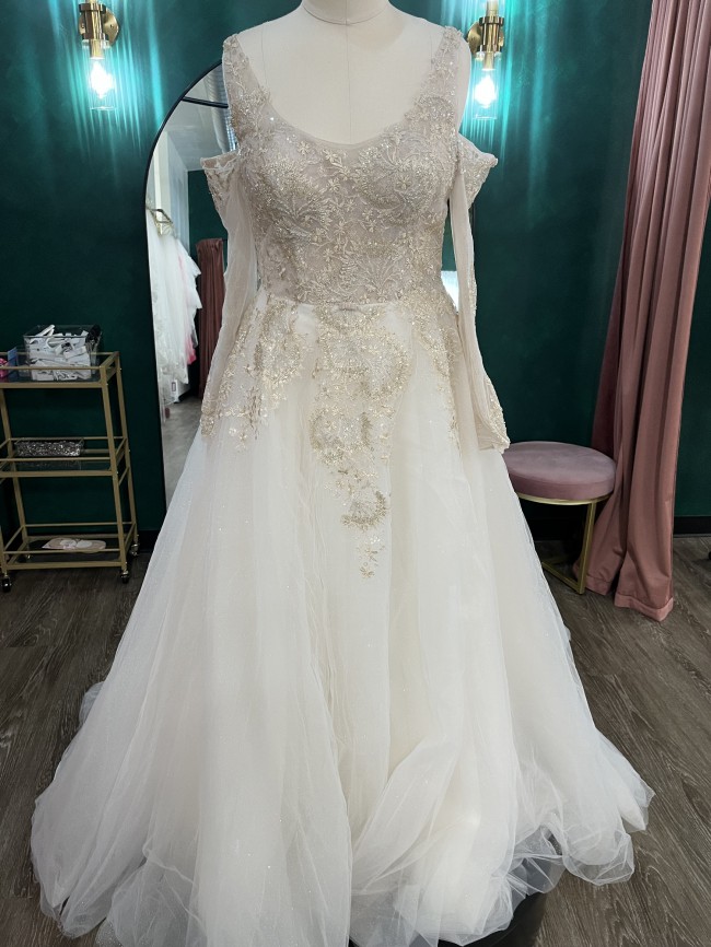 Romantic gold medallion lace bodice with a glitter skirt and detachable sleeves