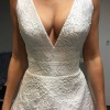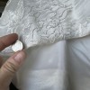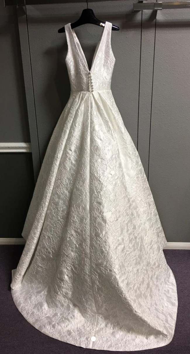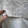 Absolutely beautiful authentic Suzanne Neville dress. Bodice has good support. Has a strong bustle. Slight wear and very minimal darkening shown on the bottom seam, the worst of which is shown in the pictures. Professionally dry cleaned immediately after wearing. I am a 32D cup size and felt secure but likely had a little room to spare if necessary.