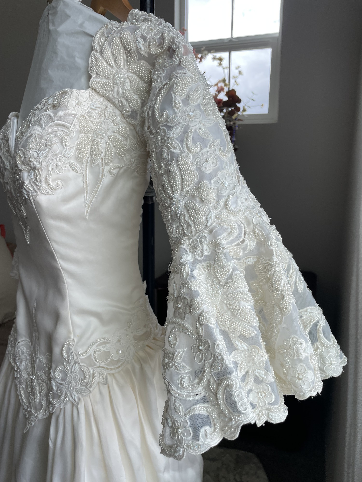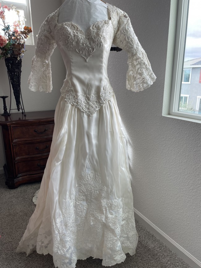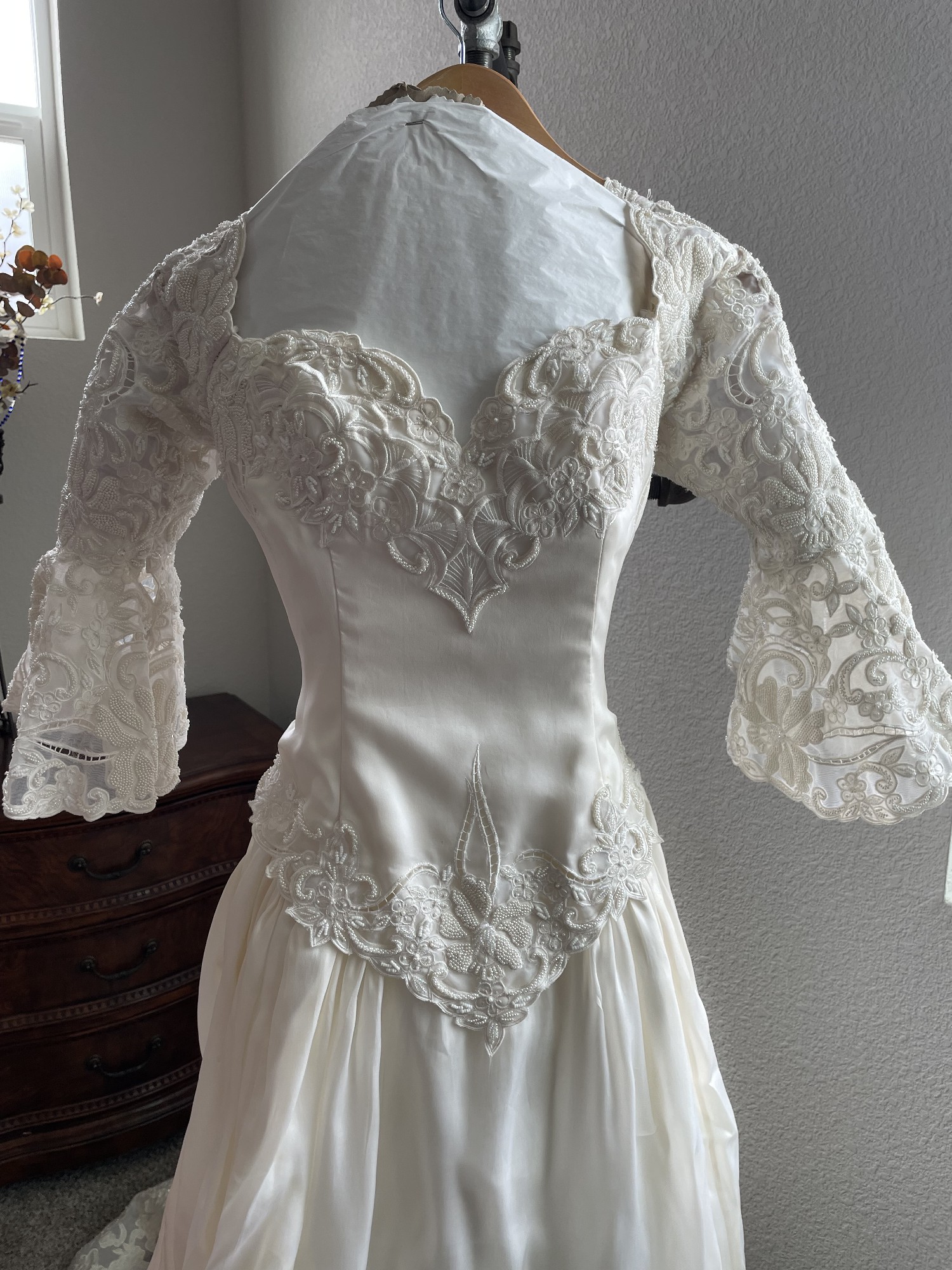 It is a beautiful gown. The silk is exquisite. The beaded sleeves are gorgeous. I felt like a princess the day I wore that dress. t has a beautiful train that can be hooked up in the the back and adds to the beauty of the dress. It was professionally cleaned and has been stored in this box for over 20 years. Only worn once.