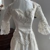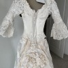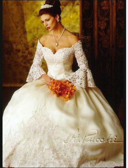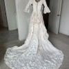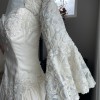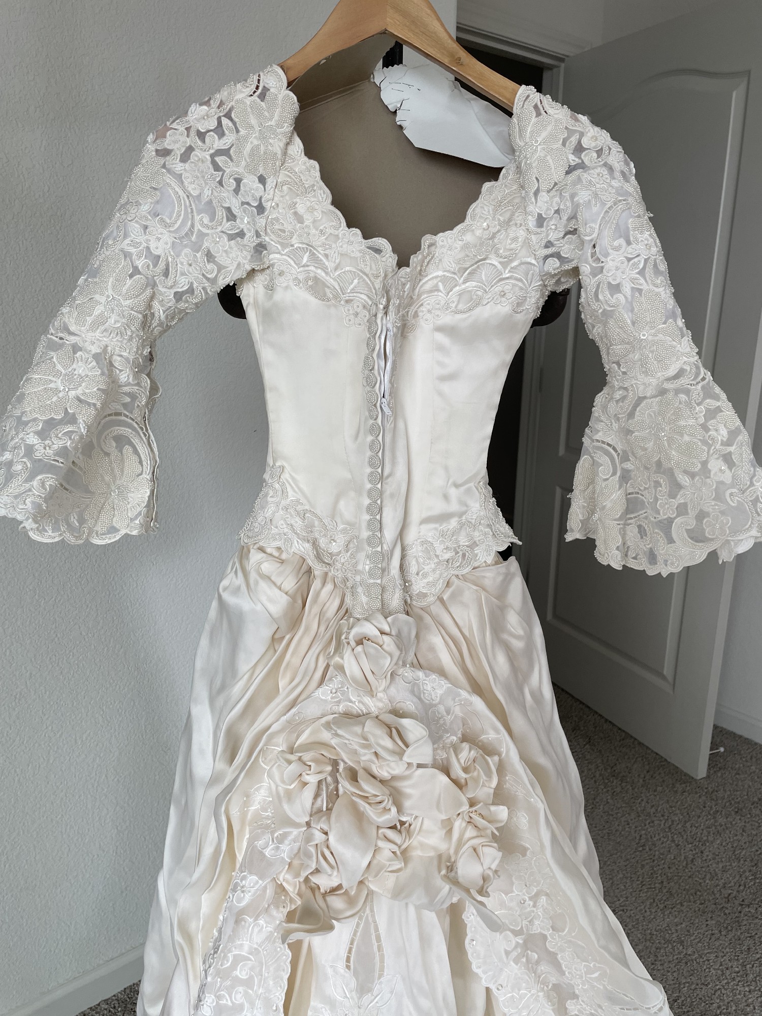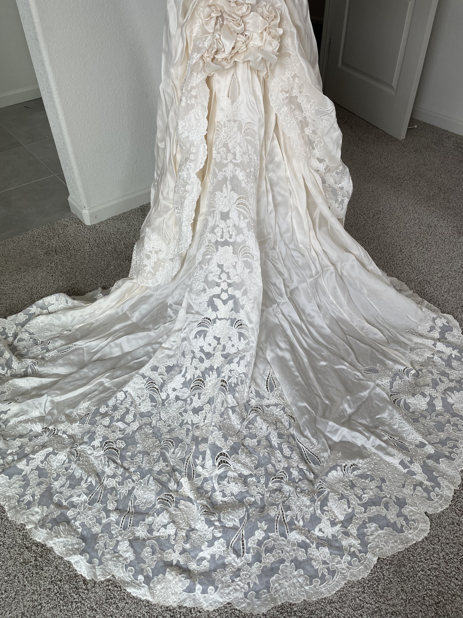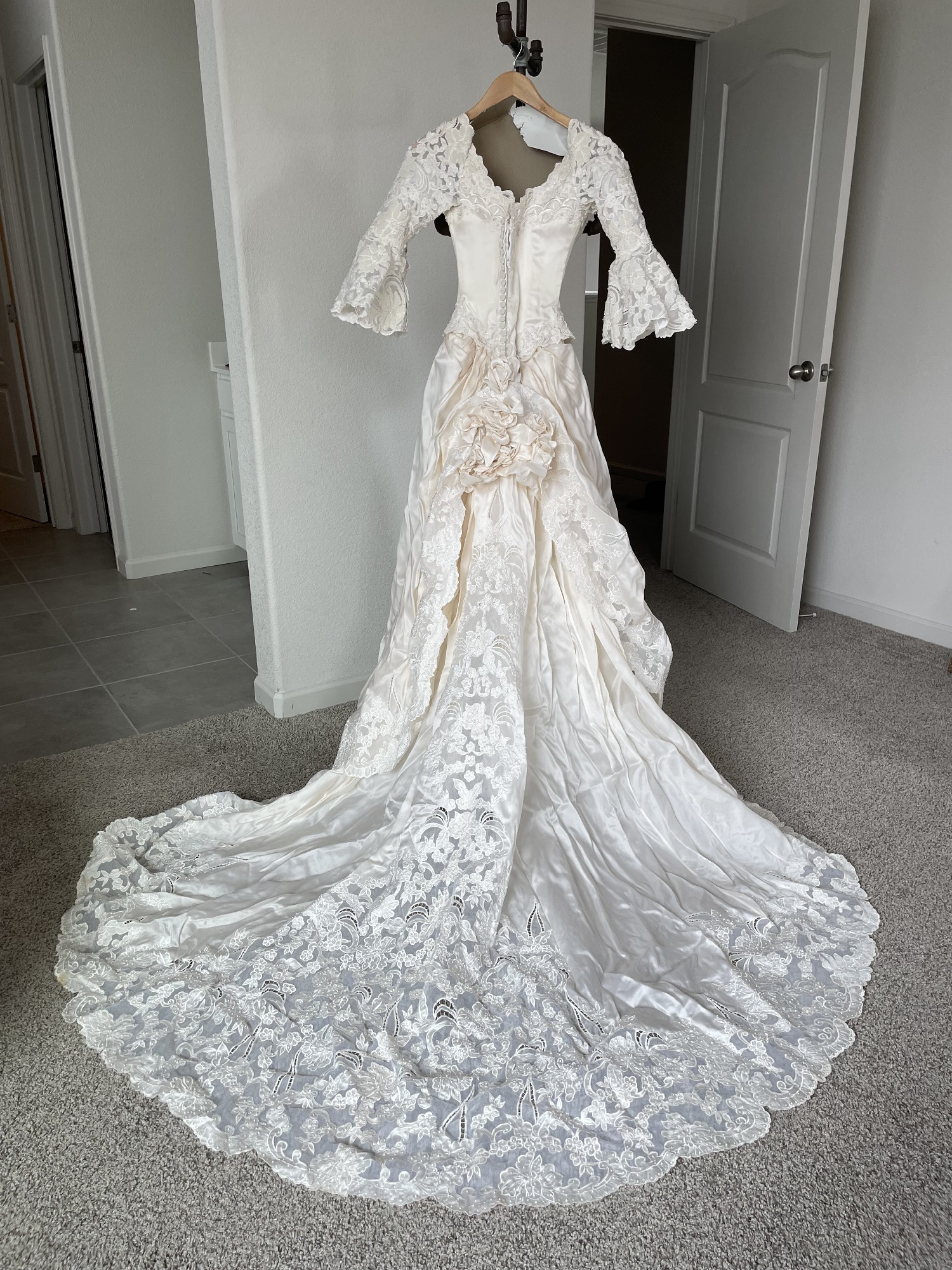 It is a beautiful gown. The silk is exquisite. The beaded sleeves are gorgeous. I felt like a princess the day I wore that dress. t has a beautiful train that can be hooked up in the the back and adds to the beauty of the dress. It was professionally cleaned and has been stored in this box for over 20 years. Only worn once.