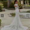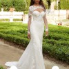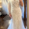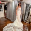 Our Fabrizia wedding dress defines seductive sophistication. The curve-hugging fit and flare, with strapless sweetheart, corset bodice, features decadent frosted embroidered lace on blingy sparkle net. The stunning illusion back emphasizes the expert corsetry and leads to a gorgeous sheer petal train. Paired with a detachable keyhole jacket overlay, this dress offers a custom feel. Shown in Ivory/Champagne/Honey.